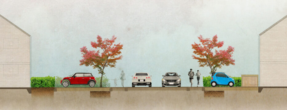 The built form for this proposed development consists low rise dwellings fronting onto a spine road that arcs through the site. At the road’s end provision has been made for vehicles to turn. Each dwelling has been provided with defensible planting, provision for parking and a refuse store. Along the route of the road trees are proposed. These trees are to be planted within tree pits joined together with soil cells. This detail will ensure these trees continue to thrive into the future.